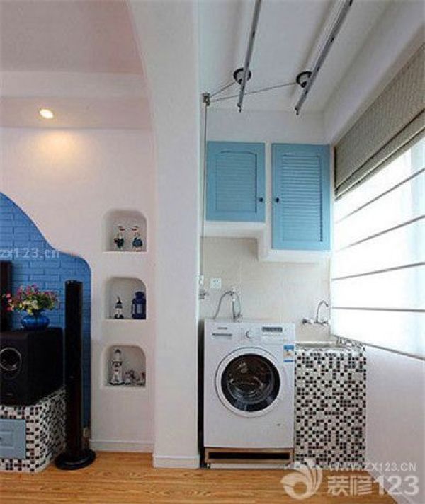 利用陽臺靠近下水道出口的特點(diǎn),將洗衣機(jī)放置在陽臺上,配以放置洗衣粉及儲存臟衣物的吊柜和低柜,也能很好地利用陽臺。