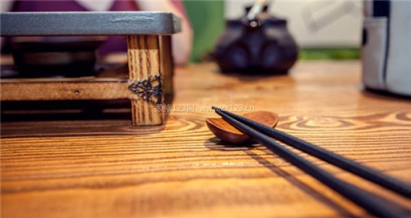 新木老做餐廳中的桌子都是鐵藝和木的結合,鐵藝桌腿,異形折邊,桌面采用風化木仿舊,質感與地面以及餐具十分接近,餐桌制作體現了傳家的采購和工廠定制能力。