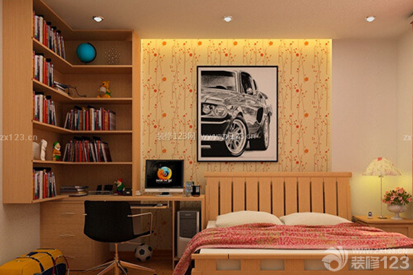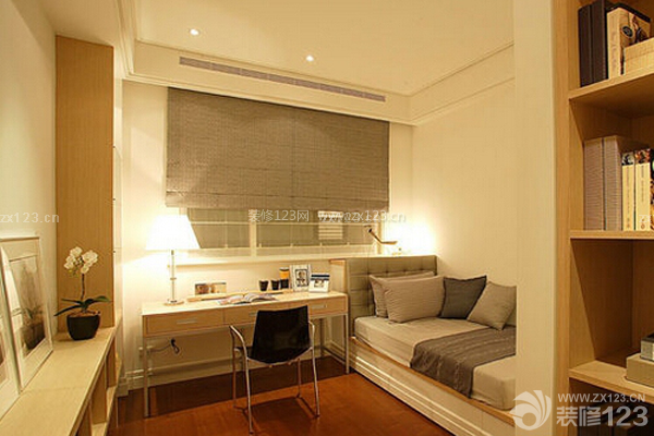 如果家里沒有單獨的書房,將書房設計在臥室內,我認為是最適合不過了,雖說臥室是休息的地方,但是在工作的時候,沒有什么地方能比臥室更安靜了,更舒適的了。這間臥室采用暖色調,墻紙顏色和床、書桌、書柜的顏色相互輝映,合理的利用了臥室的空間,使不大的臥室看起來十分溫暖、舒心,為讀書辦公營造了一個良好的環境。