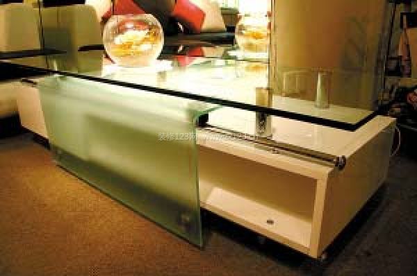 玻璃茶幾也在功能上花了很多心思,比如傳統的雙層茶幾,今年它的上層做成了可以移動的。茶幾上層玻璃可以往左右分別平移90度,方便打開取出下層的東西,同時也不會碰翻桌上的物品。
