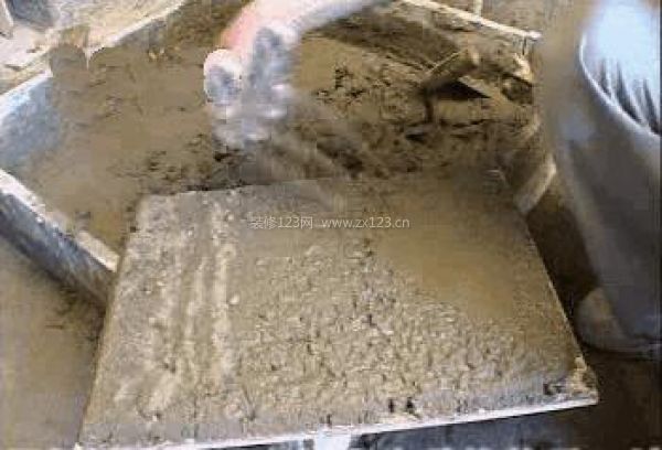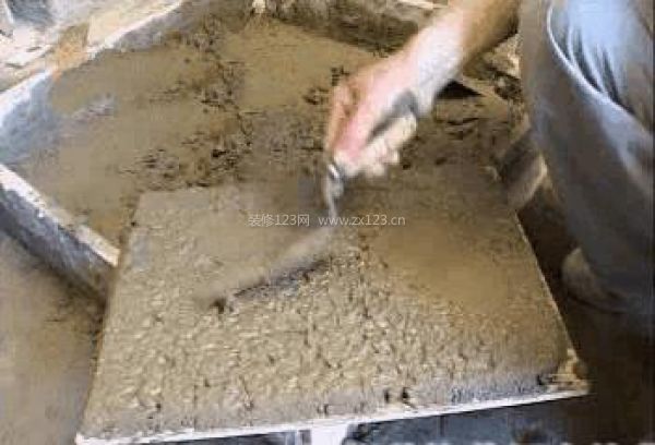 第四步:把沒有飽滿的地方填滿后,再撒上素水泥(純水泥),再次貼上墻,貼平,用橡皮錘敲結(jié)實(shí)。