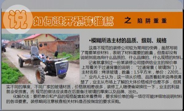 裝修公司常用伎倆就是在其所提供的房屋裝修預(yù)算中模糊所選主材的品質(zhì)、級別以及規(guī)格,雖然寫明了需要某些材料及需要的數(shù)量,但卻沒有說明到底選用什么品牌什么規(guī)格的。還有就是體現(xiàn)在計量單位上,更有甚者既是遺漏某些硬裝修的主材,這樣下來裝修貓膩便無孔不入、無所不在了,那么怎樣才能看到裝修公司貓膩呢?下面我為大家一一說明: