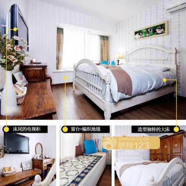 點評:來到了主臥,白色的墻面都被粉飾過。整體基本上都延續(xù)了白色搭配深色地板和木制家具的設(shè)計。主臥安裝有電視,方便主人躺在床上,舒舒服服地欣賞電視節(jié)目。飄窗鋪上了波西米亞風(fēng)格的地毯,搭配上藍色的靠枕,真的很養(yǎng)眼。
