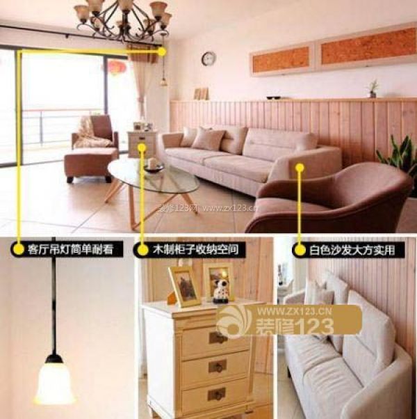 點評:白色沙發(fā)跟米白色柜子色調(diào)相近,搭配起來不顯得突兀。沙發(fā)和吊燈款式簡單卻顯得大方,木制柜子安置在這里很實用,可以把一些雜物放在里面,而不至于使客廳雜亂無章。