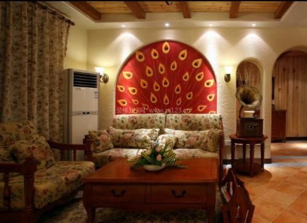 采用碎花布藝沙發和窗簾點綴出整個客廳的溫馨感,沙發背景墻采用紅色孔雀開屏圖案設計,在柔和的燈光照射下,不僅能瞬間吸引人們的目光,而且更能將地中海風格的質感與柔美展露無遺,從而使客廳的整體氣質得到極大提升。