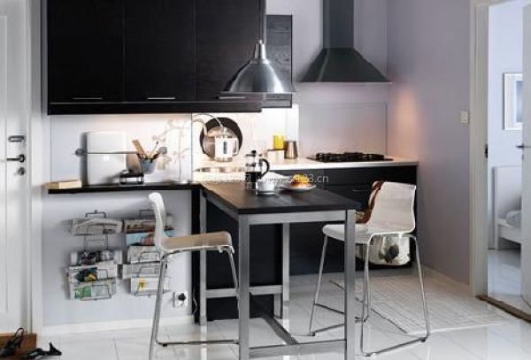 把餐桌和廚具的空間拉近一些再拉近一些,讓它融入在廚房間里。小小的空間卻有大大的功用,甚至在餐桌的側面也是你大大的儲物柜。