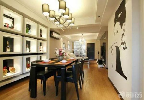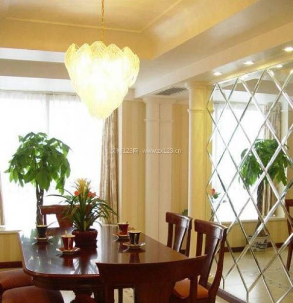 吊燈、壁燈、吸頂燈、筒燈,這些都可作為餐廳燈具的選擇。一般房間的層高若較低,宜選擇筒燈或吸頂燈作主光源。如果餐廳空間狹小,餐桌又靠墻,那就不必選擇吊燈作主光源了,可以借助壁燈與筒燈光線的巧妙配搭來獲得照明的需要,處理得當的話,一點也不比吊燈的美化效果弱。
