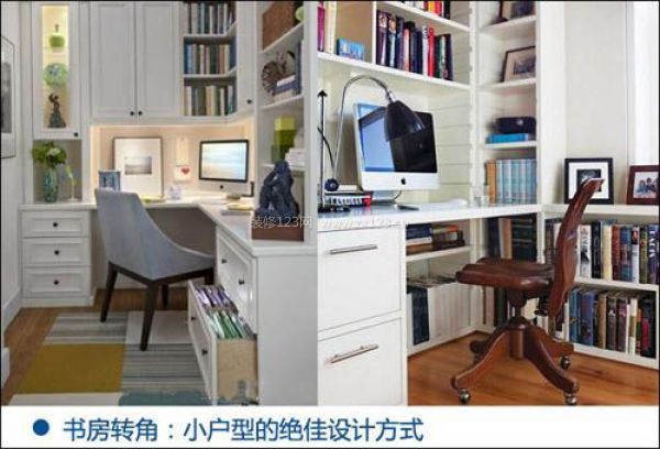 設計技巧:轉角書房多應用于小戶型中,可以利用臥室轉角、客廳轉角、陽臺轉角等小空間對其改造,再利用轉角的工作臺,設計成一個小戶型的書房。也正好了擺脫了角落空間的單調,增加其豐富性。