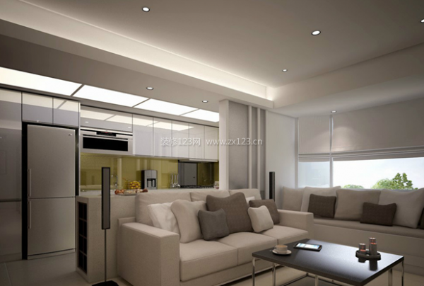 另一側的沙發后面,半人高的隔斷成為中島式廚房和客廳裝修設計的分界線。同時讓這個客廳能夠容納更多的物品。