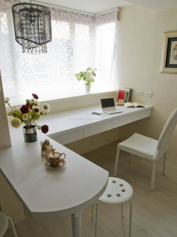 臨窗安置L型的書桌,簡潔大方的書桌造型讓人耳目一新。讓平時的工作擁有一角安靜的空間,同時一側手臂剛好成為書房空間的獨立分割。