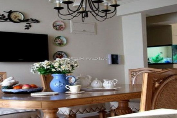 掛式液晶電視有效的利用了垂直空間。在電視墻面上,粘貼有漂亮的,亞瑟各異但是形態(tài)類似的裝飾鐘,仿佛時光倒流。餐桌上雅致的茶具加上美麗的插花。在尊貴中透露出悠閑。