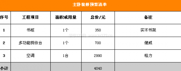 主臥的裝修預算清單(業主只列出相關家具所花費的費用)如下,