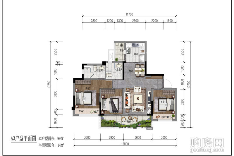 【戶型A3】:3室2廳,朝向?yàn)槟希婕s99㎡,參考單價(jià)約22000/㎡