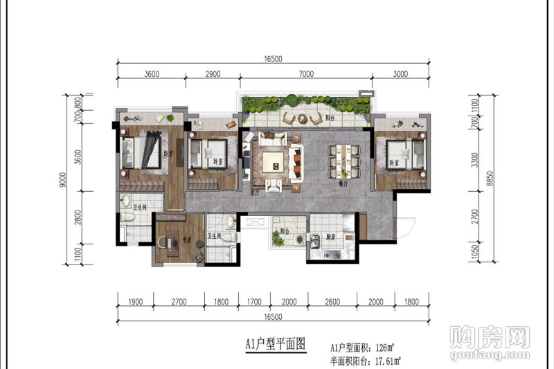 【戶型A1】:4室2廳,朝向?yàn)槟希婕s126㎡,參考單價(jià)約22000/㎡