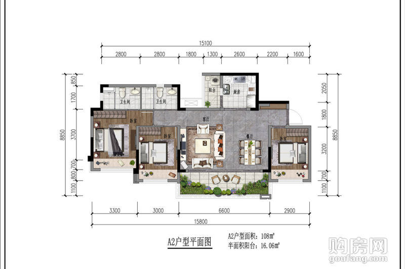 【戶型A2】:3室2廳,朝向?yàn)槟希婕s108㎡,參考單價(jià)約22000/㎡