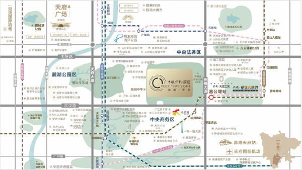 中糧保利天府時區處于天府新區三大板塊的交匯處,能同時中央商務板塊與中央法務板塊成熟的城市資源配套,又能享受到麓湖板塊的自然生態資源,項目被天府新區五大公園環繞,周邊商業配套建設6.2萬方商業“綠魔方”,休閑購物娛樂聚餐都能就近解決,中糧保利天府時區是保利攜手中糧入局昌公堰TOD打造項目,于城市中建立慢行步道、高樓林立中打造慢耍公園、繁華街區里融入慢調休閑、讓院落生活走進城南,以低密TOD打造一座慢活大城。