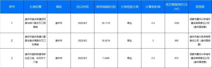 崇州市第3宗土地出讓時間為2022年8月2日,土地位置位于崇州市崇陽街道毛橋社區(qū)三組、白石村十六組,凈用地面積為7.5406,土地競得者為成都市蜀州興宇城市建設(shè)有限責(zé)任公司(崇州國資委),成交樓面地價為812元㎡。土地用途依舊為商業(yè)用地。