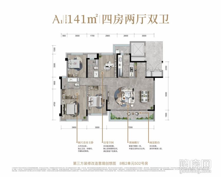 4室2廳2衛(wèi),A1 戶型 141㎡ 四房?jī)蓮d兩衛(wèi)(4室2廳,141平,南北)
