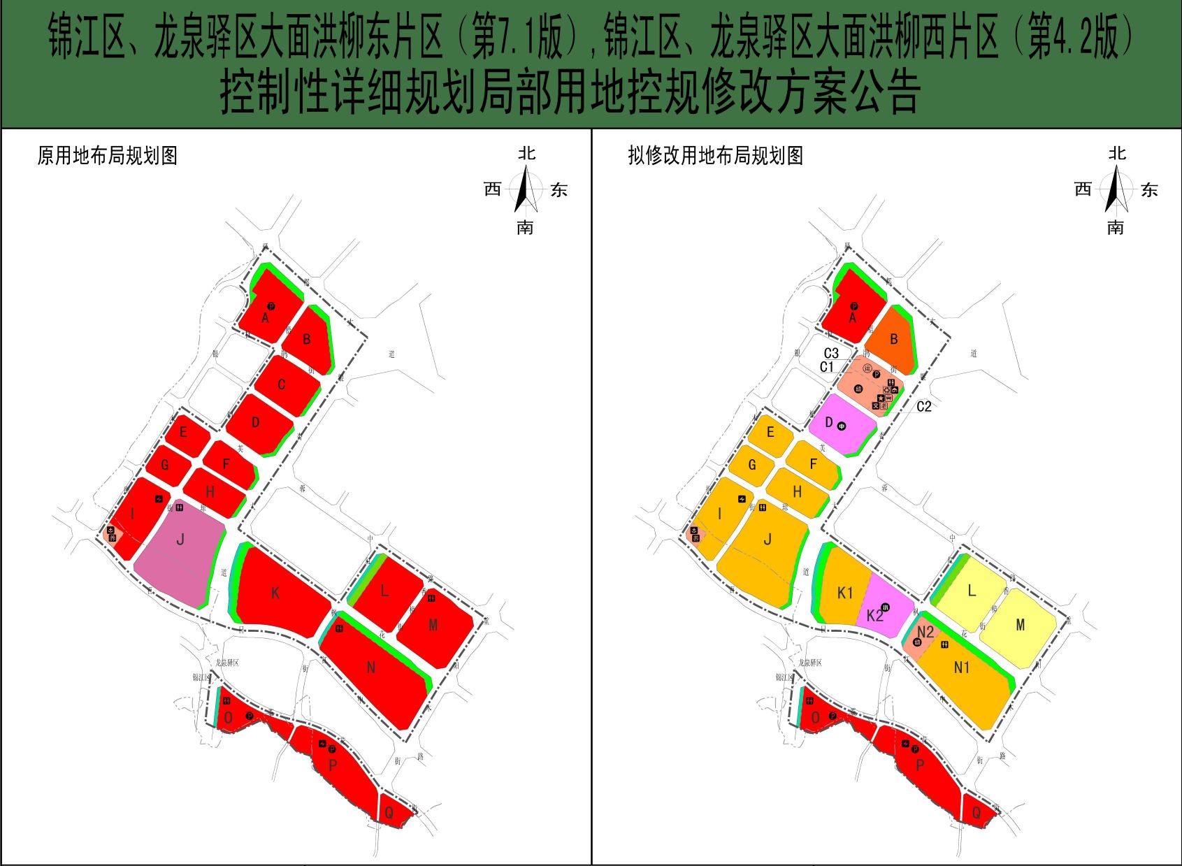 (成都市規劃和自然資源局公布的錦江區和龍泉驛區交界處的大面洪柳東和洪柳西片區的規劃變更。紅色部分為商業服務業設施用地,黃色部分為二類住宅用地,橙色部分為二類住宅用地兼商業服務業設施用地,紫色部分為公共服務用地。 )