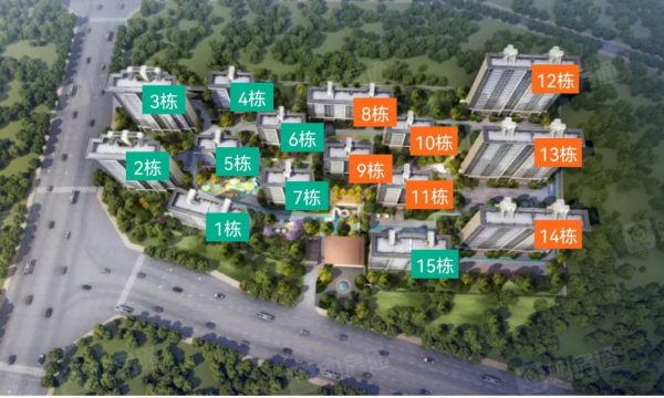 五礦香投桂語堂位于成都市新都區(qū)蓉北路三段與敬成路交匯處,總建筑面積120814.49㎡,住宅建筑面積77098.32平方米;非住宅建筑面積310.68平方米;機(jī)動(dòng)車庫車位1024輛;非機(jī)動(dòng)車庫車位855輛;綠地率35%,總綠地面積13546.73平方米;容積率2.0。