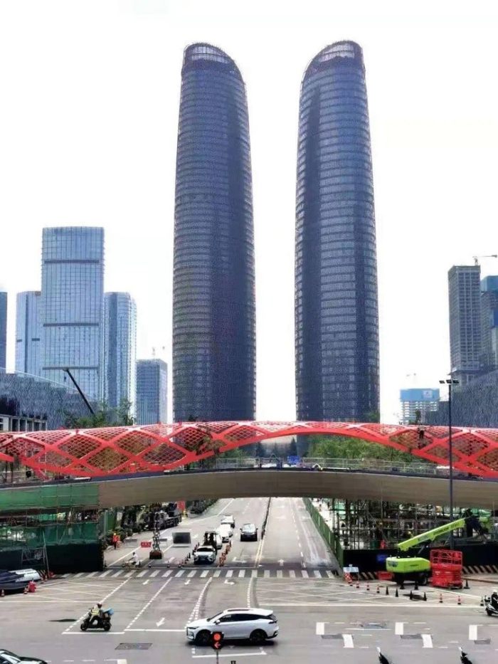 “交子之環(huán)”為直徑96米環(huán)形平面,結(jié)構(gòu)分層為結(jié)構(gòu)環(huán)、交通環(huán)、風(fēng)雨環(huán)廊,四根“V”腿斜柱像手掌一樣托住整個(gè)上部建筑物。該橋鋼結(jié)構(gòu)屬異形空間結(jié)構(gòu),主要包括結(jié)構(gòu)環(huán)、交通環(huán)和風(fēng)雨環(huán)廊三部分,工程量約3500噸。無論是在技術(shù)上、造型上還是時(shí)間上,“交子之環(huán)”都十分具有挑戰(zhàn)性。因?yàn)檫@需要工程師們進(jìn)一步克服了各種難題,比如復(fù)雜地形的空間鋼箱梁測(cè)控、大型‘V’型支腿深化與制造、復(fù)雜異性雙曲構(gòu)件空中翻面等等。